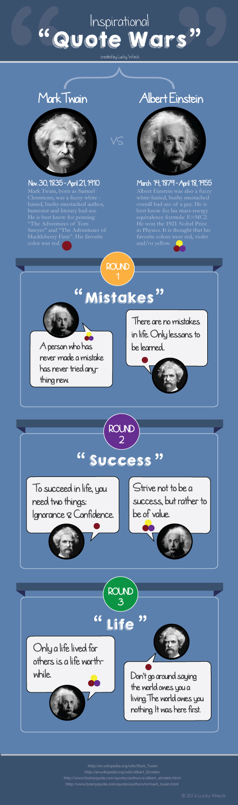 I’ve concocted a scenario of what it might be like if these two fluffy-stached guys got into it and had a “quote war”. Please enjoy this infographical battle of fuzzy white-haired wisdom!